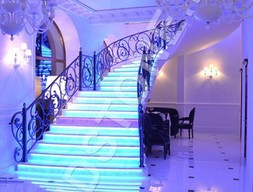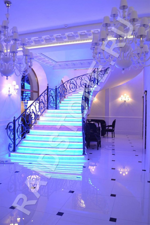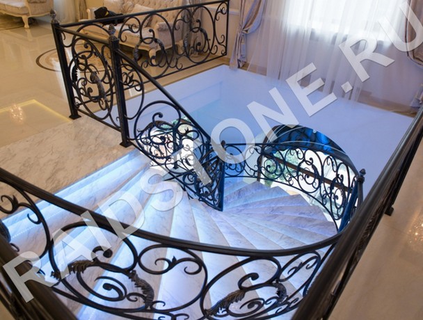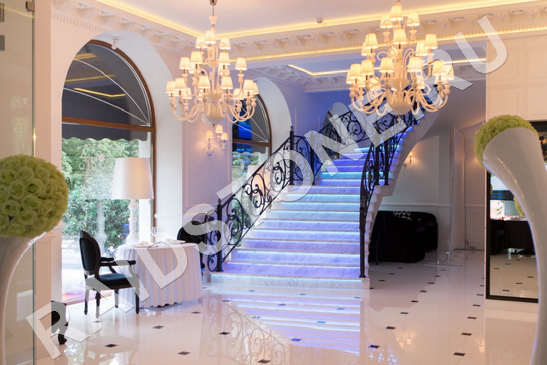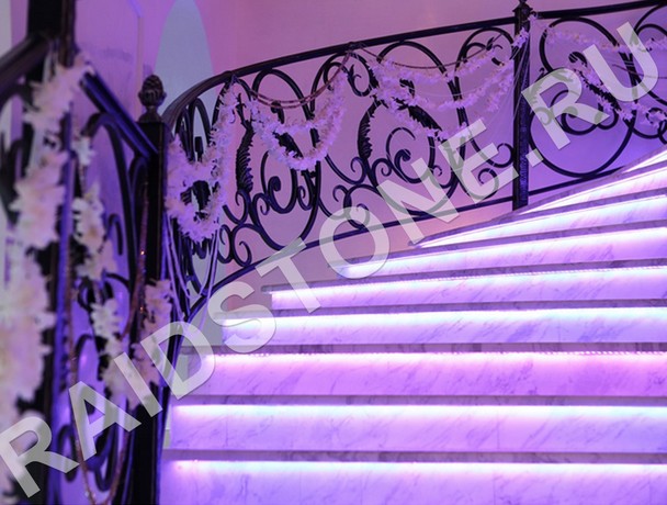Для создания парящего эффекта ступени оснащаются оригинальной светодиодной подсветкой. Под световую ленту в торце или на лицевой стороне подступенка или на нижней поверхности проступи изготавливается паз. Натуральный природный материал полируется, поэтому за ним легко ухаживать, но эта работа для профессионалов. Лестницы изготавливаем комбинированные на металлической раме с мраморными балясинами и декоративными стойками. Возможна интеграция конструкции в любые по объему и архитектурной сложности помещения.