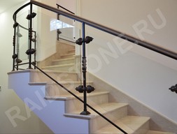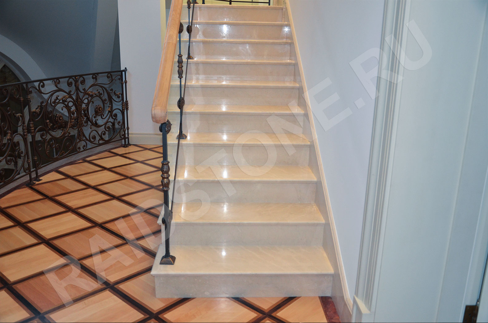 Лестница, плинтус на стене (галошница) и поручень на кованных перилах из мрамора.