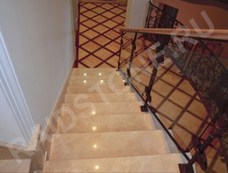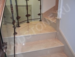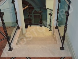 Природный минерал Крема Марфил отличается приятным песочным цветом и повторяющейся текстурой с теплым оттенком. Для облицовки лестничных пролетов используются прямоугольные ступени с дизайнерской фаской. Также камень режется по радиусной траектории для закругленных пролетов или площадок в конструкции лестниц.