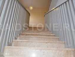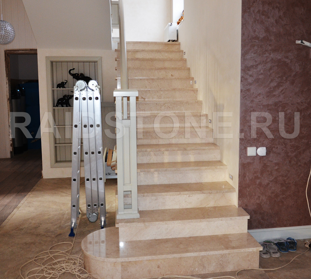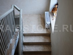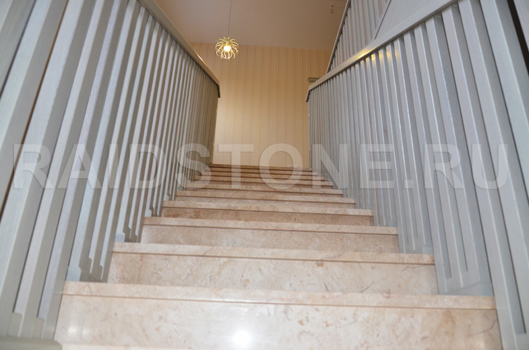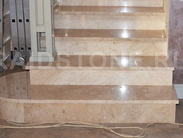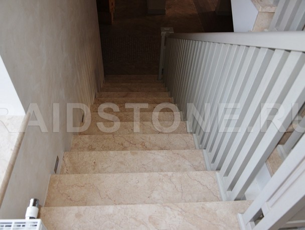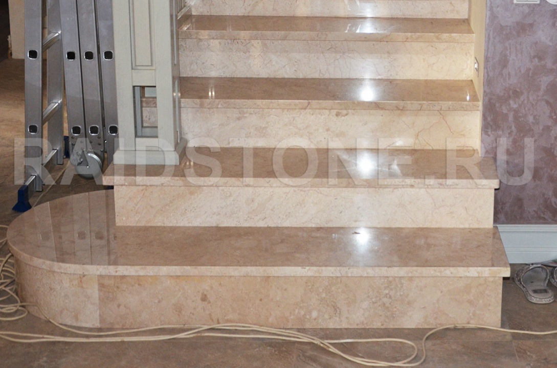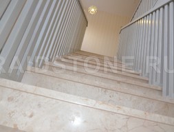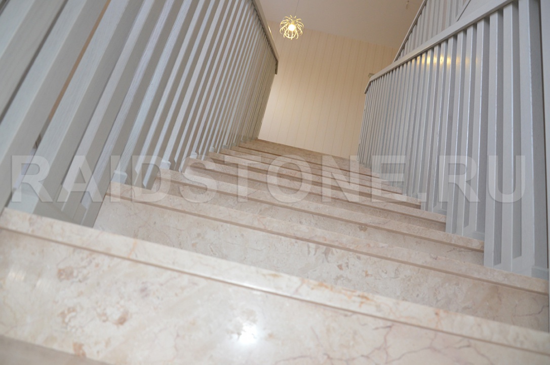 Компания Raidstone изготавливает под заказ мраморные ступени для лестниц любой сложности. Для облицовки марша в частном доме или гостинице используется турецкий мрамор Crema Nuova. Он имеет теплый бежевый оттенок с песком. С помощью такого натурального камня можно создавать по-настоящему уютную обстановку.