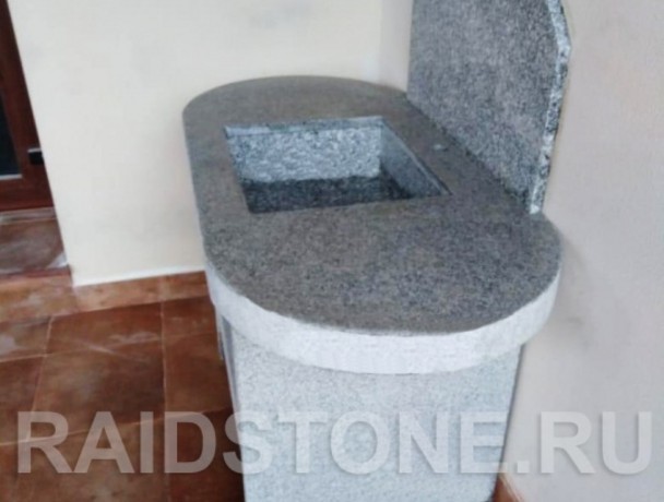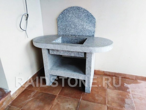 Тумба с раковиной из гранита отлично подходит по стилю всей зоне барбекю. Зона оформлена в серых тонах, в стиле лофт, поэтому тумба выполнена из гранита Роял вайт, с термообработанной поверхностью. Единственные полированные поверхности - столешница и раковина. Тумба состоит из металлической под конструкции, облицованной гранитом. Толщина столешницы, ножек и полки - 10см. Это массивное изделие стало одним из главных элементов зоны барбекю. Каменная тумба с полкой удобна и как стол, и как рабочая зона для приготовления пищи, и как зона для хранения предметов кухонной утвари на полке, и в качестве мойки для кухни. Тумба изготовлена по эскизу дизайнера интерьера частного дома.
