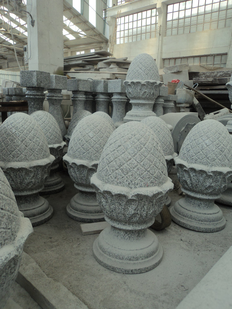 Архитектурный элемент на лестничный марш (навершие, декоративный элемент в виде шишки на тумбу балюстрады) из гранита для здания оздоровительного центра Плеского. Фото производственного процесса архитектурных элементов балюстрады.