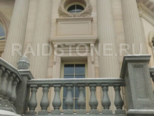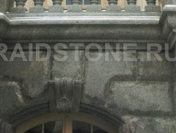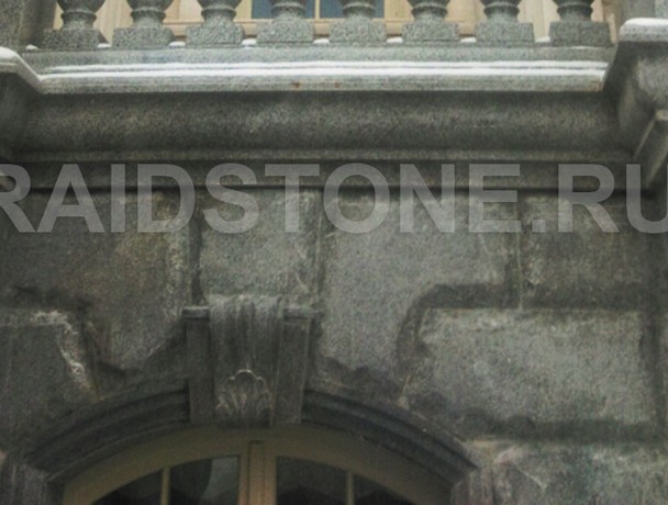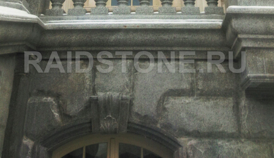 Замковые камни из гранита на обрамлении арочных окон цокольного этажа здания.