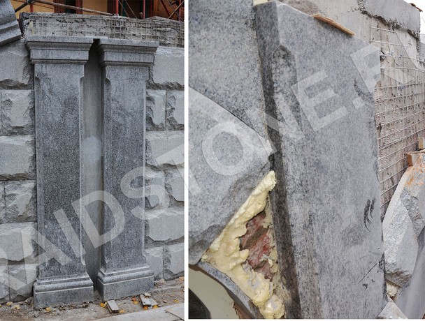Гранитные блоки (рваный камень) для облицовки цоколя здания.