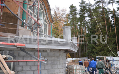 Общая стоимость монтажных работ по облицовке рваным камнем цоколя, и 12 полуколонн на цоколь: 850 000 руб. (с расходниками).