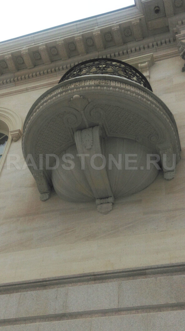 Облицовка чаши балкона и нижней части декоративными элементами в виде "лепестков" и панелей с барельефами.