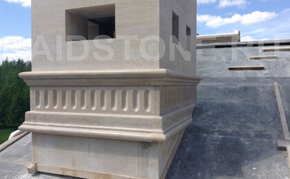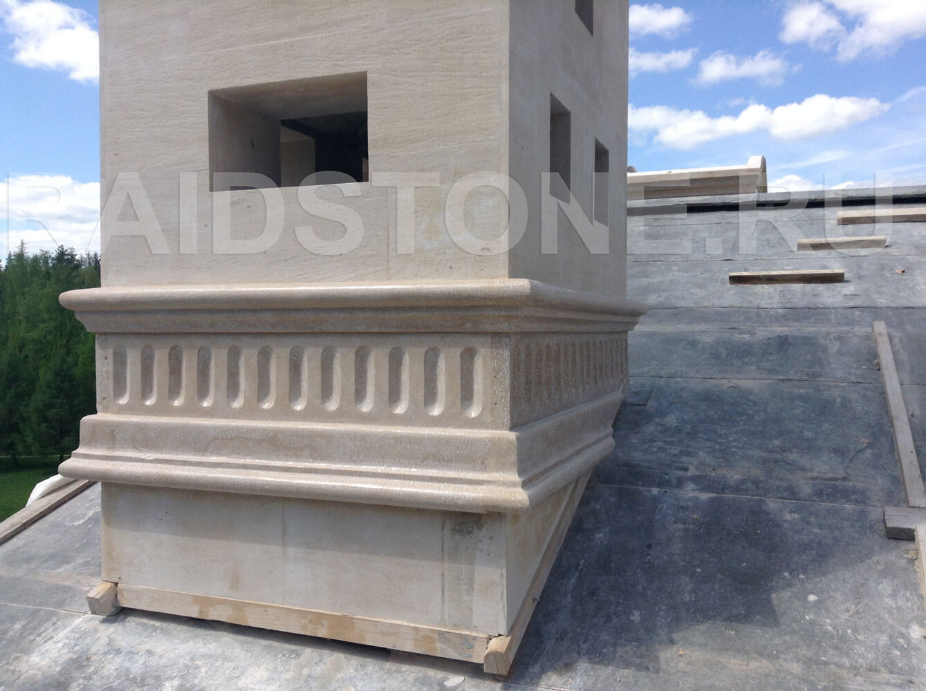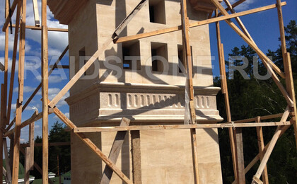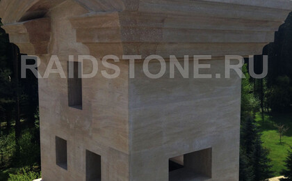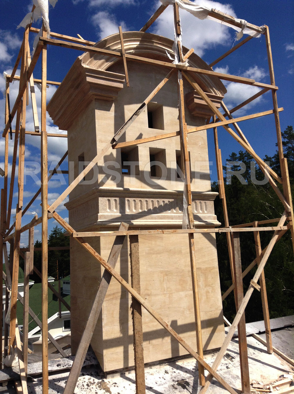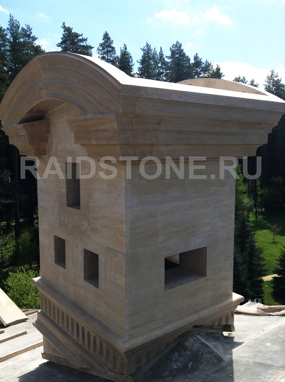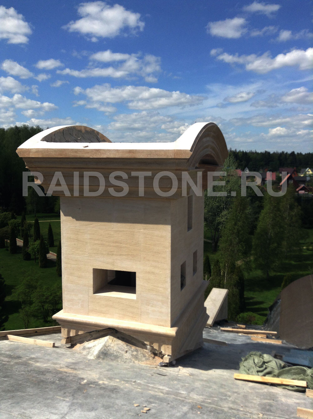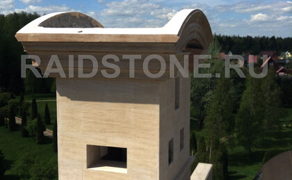Облицовка фасада вентшахты здания оздоровительного центра натуральным известняком Мока Крем (Португалия) и искусственным камнем по технологии АрКон (аналог натурального камня, полученная из крошки натурального камня с компаундом).
