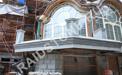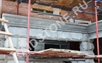 Материал облицовки площадок террасы, балюстрады (колонны, балясины, поручни), рваный камень на цоколе: китайский гранит Роял вайт (Royal white).