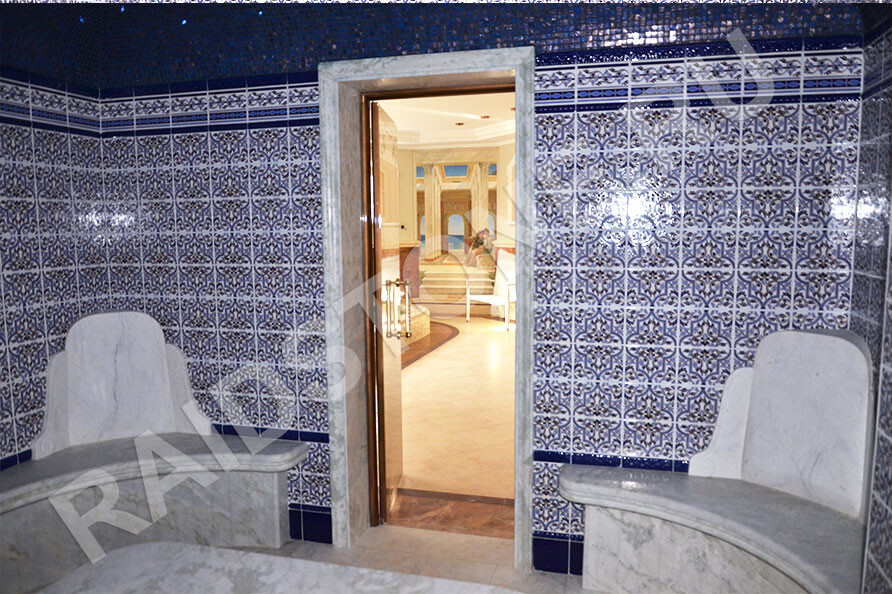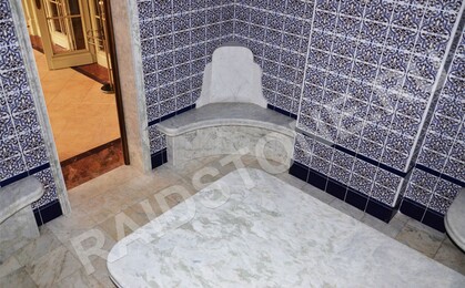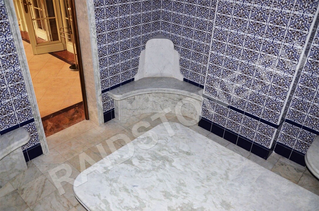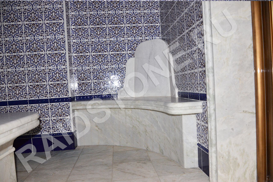 Облицовка сиденья в турецкой бани мрамором Мисти вайт роуз.
