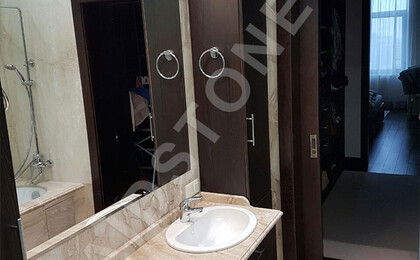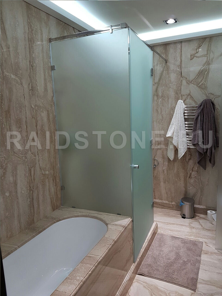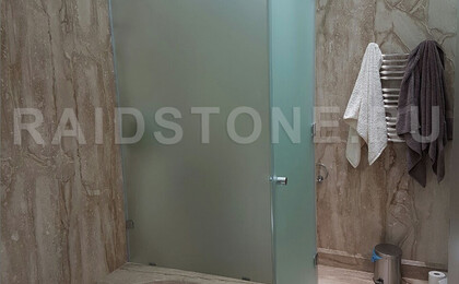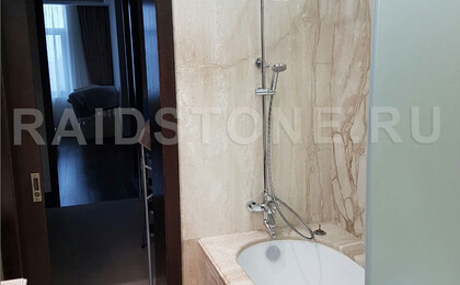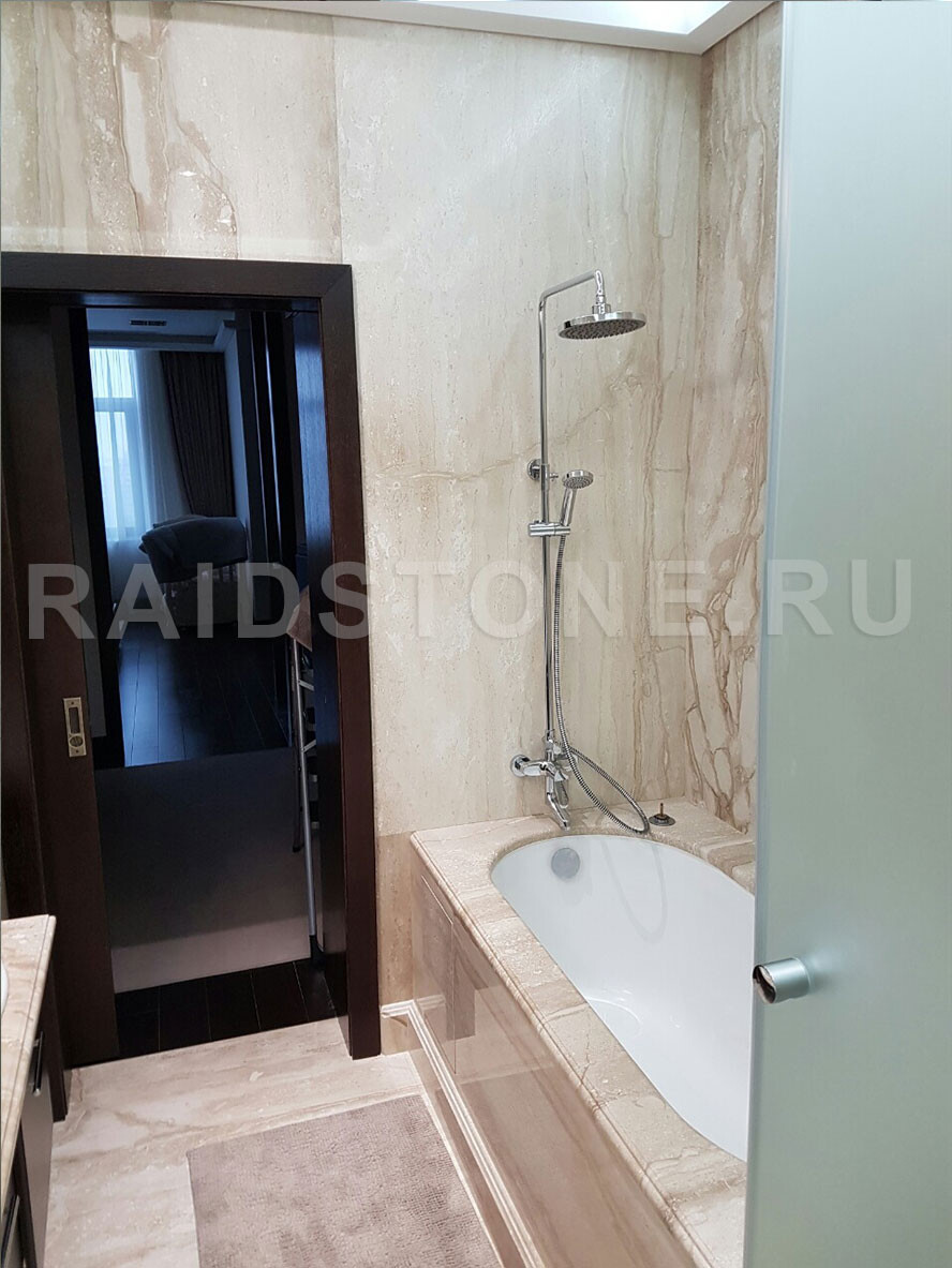 Облицовка пола, стен ванной комнаты слэбами мрамора.
