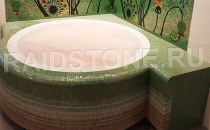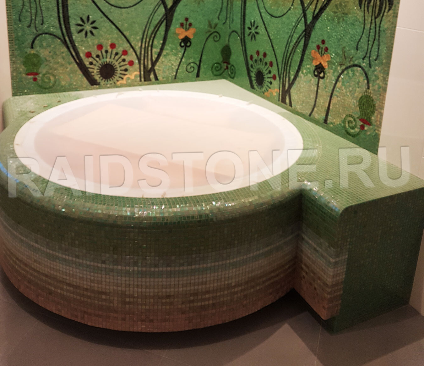 Облицовка ванны, поддона душевой и стены в ванной комнате. Цена мозаики на стену 3х2м: 70000 р. Цена мозаики на поддон и ванну: 7200 р/м2. Общая стоимость облицовочных работ с материалом: 155000 р. Детская ванная комната по адресу: поселение Кокошкино, Новомосковское АО